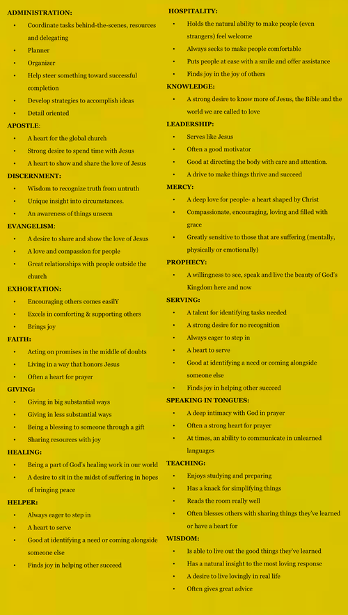 If interested in exploring your spiritual gifts, a modern day elaboration is listed below.